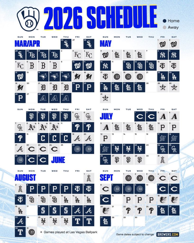 - Yes, the game dates and times in the 2026 Brewers schedule are subject to change due to various reasons such as weather conditions, TV broadcasting schedules, and other unforeseen circumstances.