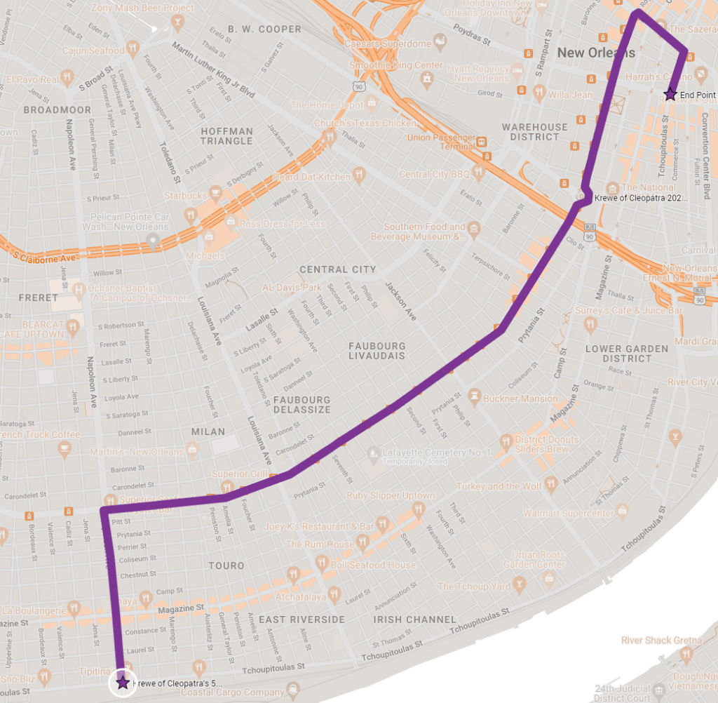 The Zulu Parade traditionally starts in the Treme neighborhood and continues through various streets of New Orleans.