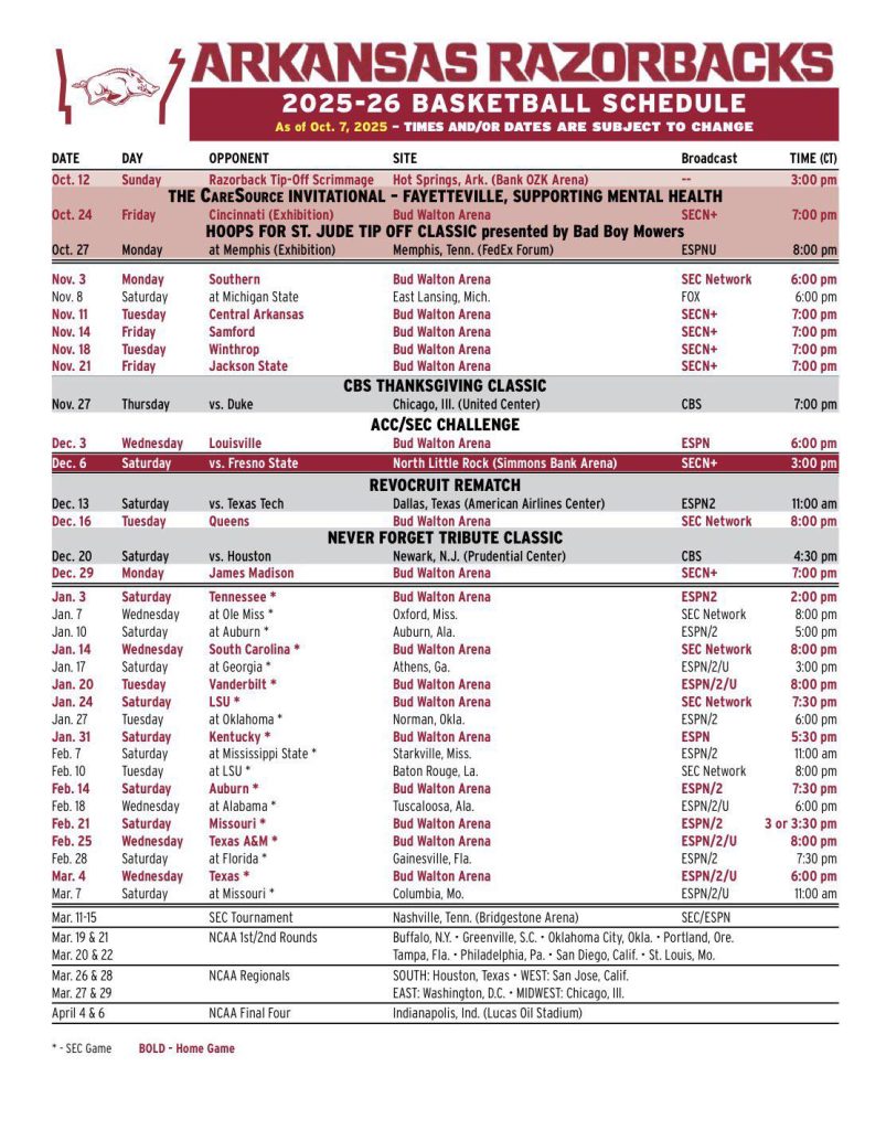 - When is the first Arkansas basketball game scheduled for 2026?