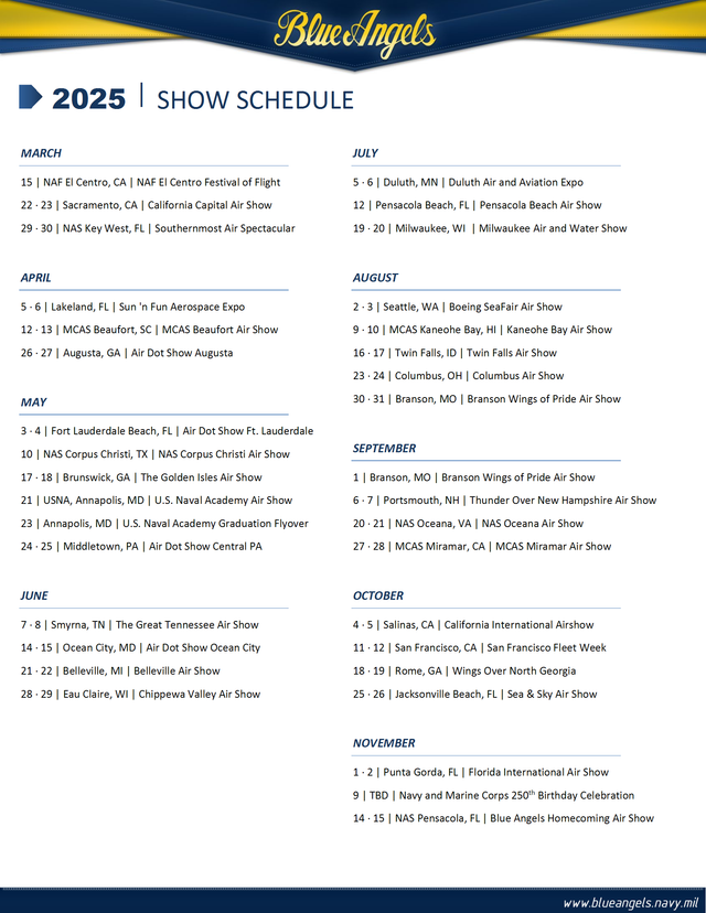 As summer approaches, the Blue Angels will visit multiple airshows and events. Join them at the Chicago Air and Water Show in early August, showcasing their expertise in the skies.