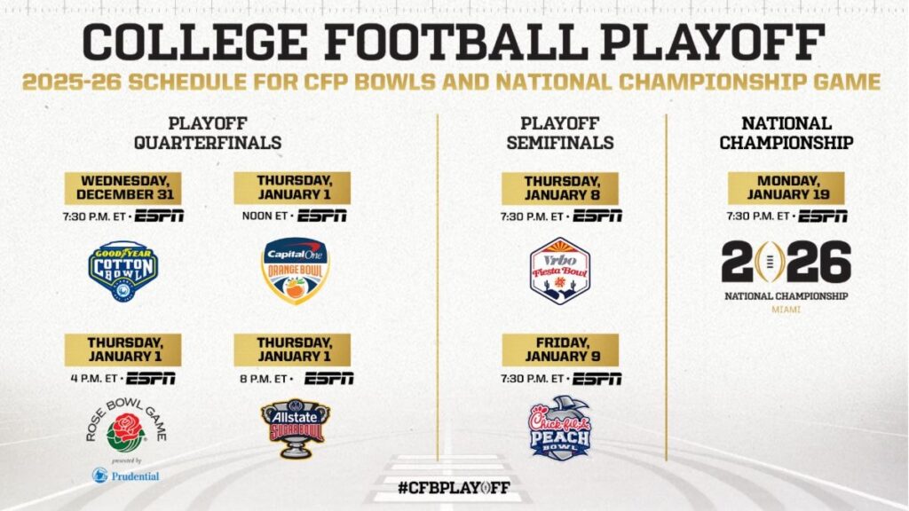 Are you eagerly awaiting the latest updates on the much-anticipated CFP 2026 schedule? Look no further! The CFP (College Football Playoff) has become one of the most thrilling events in collegiate sports, and fans are always on the edge of their seats for the upcoming schedule announcements. The CFP 2026 schedule promises to bring a mix of intense matchups, fierce rivalries, and unforgettable moments on the field. Whether you’re a die-hard fan or simply love the excitement of college football, this schedule is bound to have something for everyone. Stay tuned as we delve into the details and highlights of the upcoming CFP 2026 schedule!