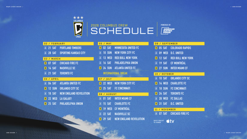 - The Columbus Crew 2026 schedule is typically released in the months leading up to the start of the 2026 season. Stay tuned for announcements from the team and the MLS.