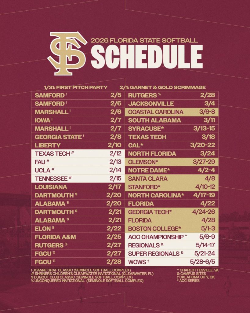 Be sure to keep the following dates in mind for the Florida State Softball Schedule 2026: