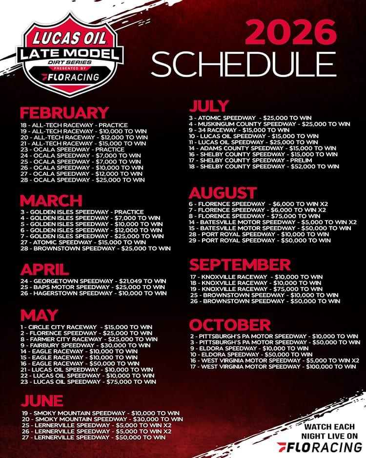 Welcome to the highly anticipated Lucas Oil Late Models 2026 schedule! As fans of dirt track racing eagerly await the upcoming season, the release of the 2026 schedule has generated immense excitement and speculation. The Lucas Oil Late Model Dirt Series is renowned for its exhilarating races featuring top drivers and cutting-edge performance. This year’s schedule promises to deliver thrilling competition, intense rivalries, and unforgettable moments on the track. With race events scheduled across various iconic tracks, fans can look forward to witnessing the best of dirt track racing action. Let’s dive into the details of the Lucas Oil Late Models 2026 schedule and get ready for an unforgettable racing season!