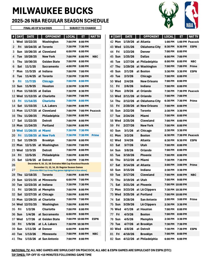 - Once the Milwaukee Bucks schedule for 2026 is released, you can find it on the official NBA website, the Milwaukee Bucks’ official website, as well as on various sports news websites and apps.