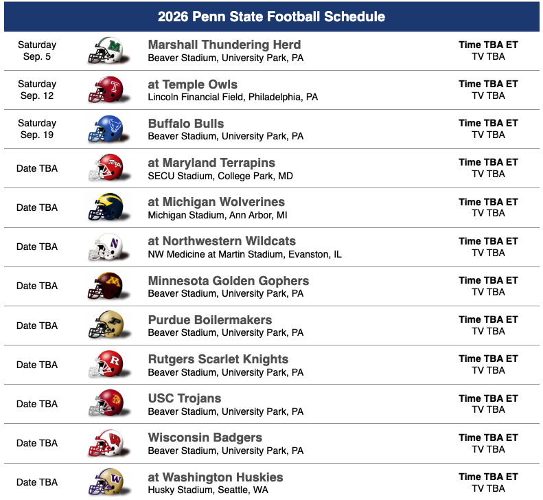 - The 2026 Penn State football schedule may include home games at Beaver Stadium. Keep an eye out for the finalized schedule to know where the games will be held.