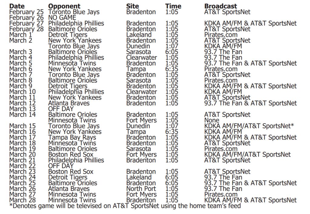 - You can find the Pirates Spring Training Schedule for 2026 on the official Pittsburgh Pirates website or through sports websites and platforms that cover MLB schedules.