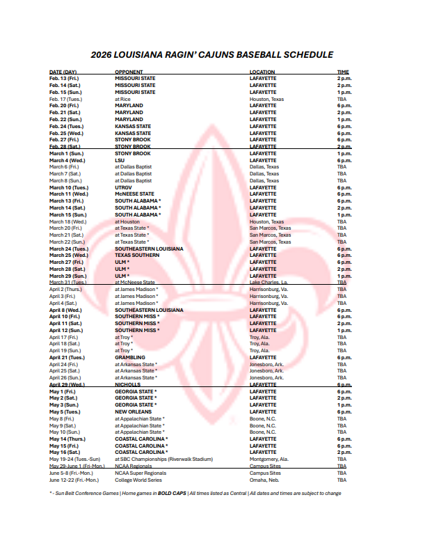 Are you ready for an exciting season of ULL baseball in 2026? The ULL baseball schedule for 2026 is officially out, unveiling a lineup of thrilling games and promising matchups. Fans and enthusiasts can now mark their calendars and gear up to support the Ragin’ Cajuns as they hit the field for an action-packed season. From intense rivalries to crucial conference clashes, the ULL baseball schedule 2026 is packed with opportunities to witness the team’s skills and determination in action. Stay up to date with the schedule to ensure you don’t miss out on any of the exhilarating moments that the upcoming season has in store!