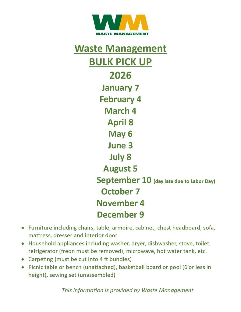 - The waste management pickup schedule for holidays in 2026 may vary depending on your location and the waste management company servicing your area. It is recommended to check with your local waste management company for specific schedules.